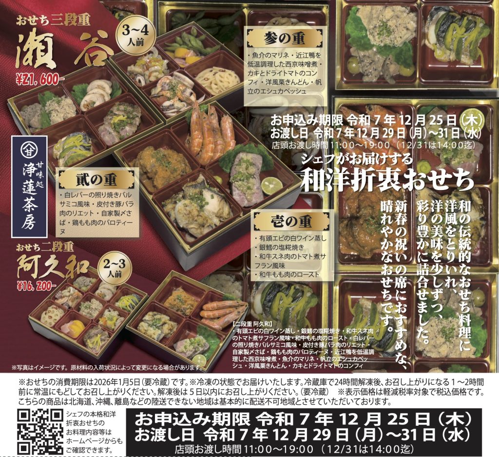 本日より、戸塚モディにて催事出店しております… 続きを読む: 12/26金曜〜大晦日12/31迄 丸井食遊館1F(Modi戸塚)催事出店(浄蓮茶房) - まだ間に合います!和洋折衷おせち2026